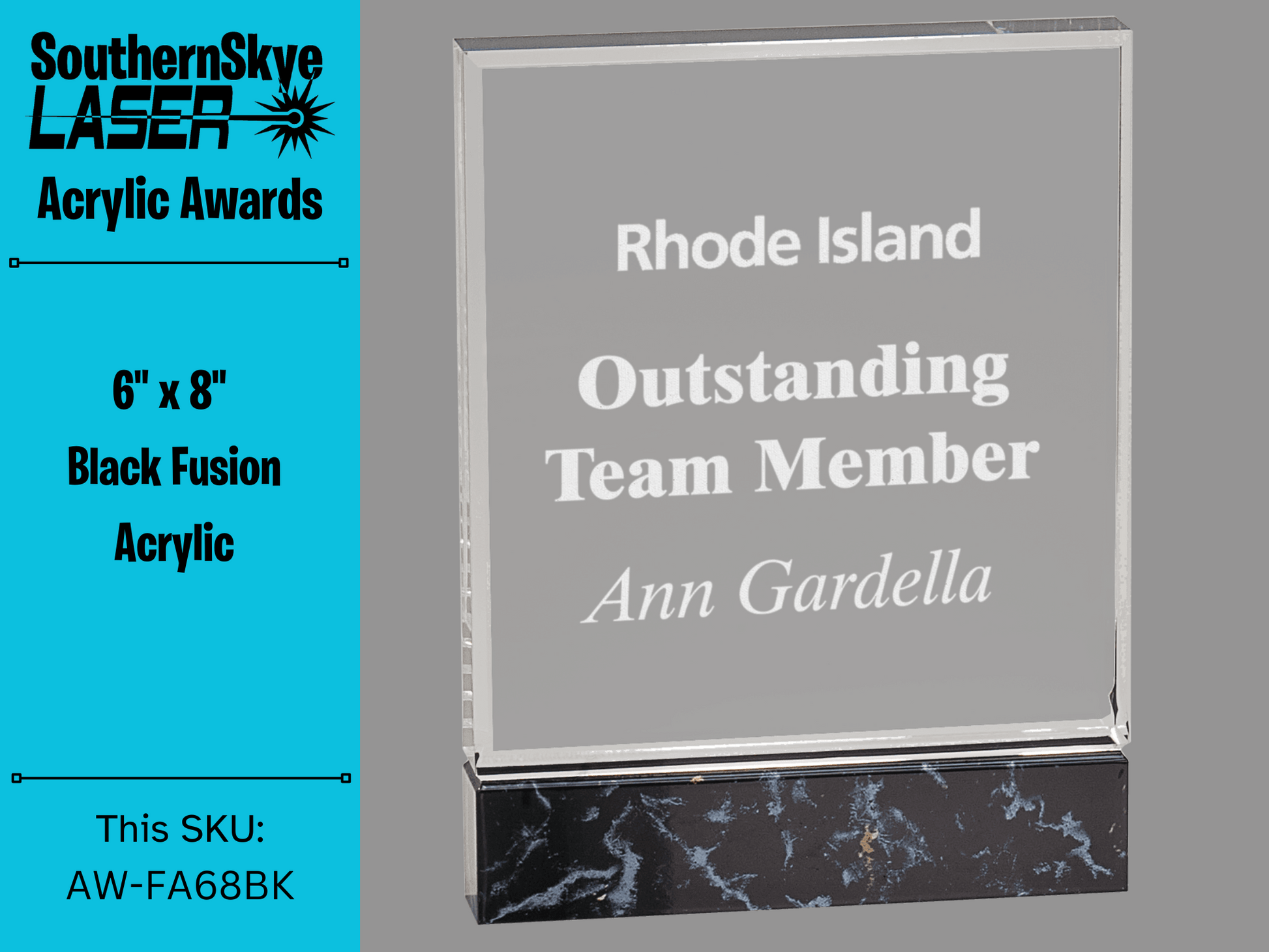 Fusion Acrylics are self- standing and 1 inch thick. This 1-piece acrylic award has Hydrofoil graphics that provide a beautiful black marble finish.