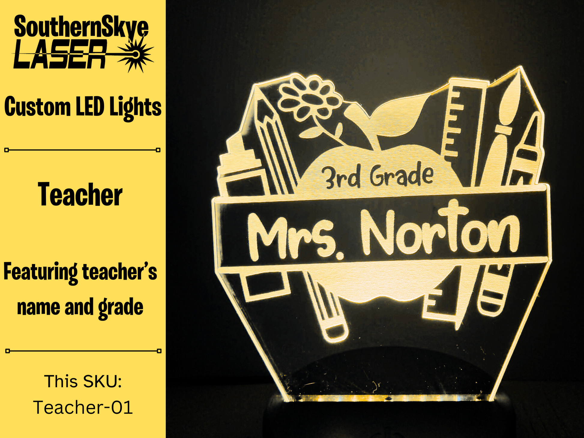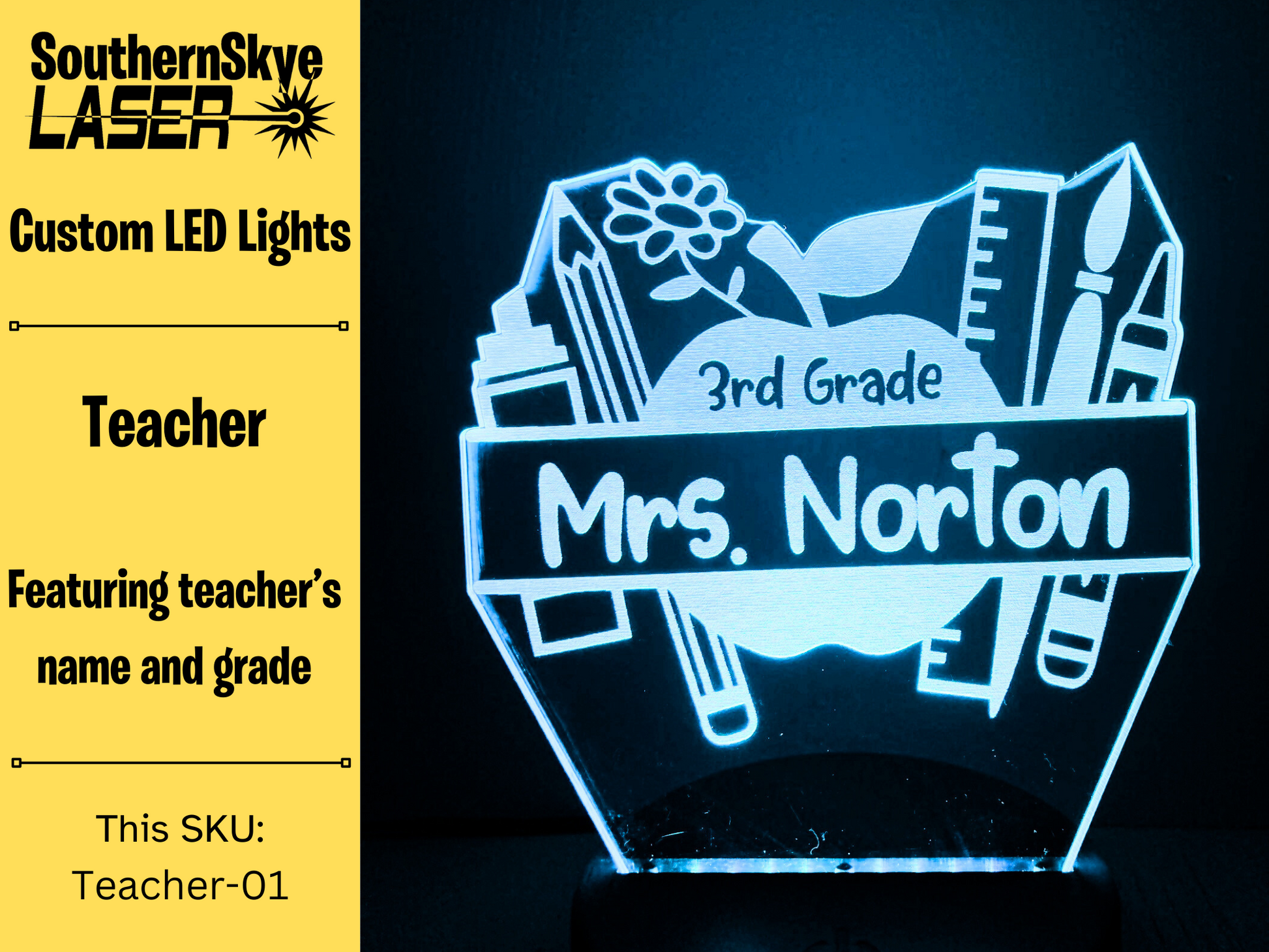 Teacher LED Light Apple featuring teacher's name and grade number, Night Light, Desk Light Personalized Gift.